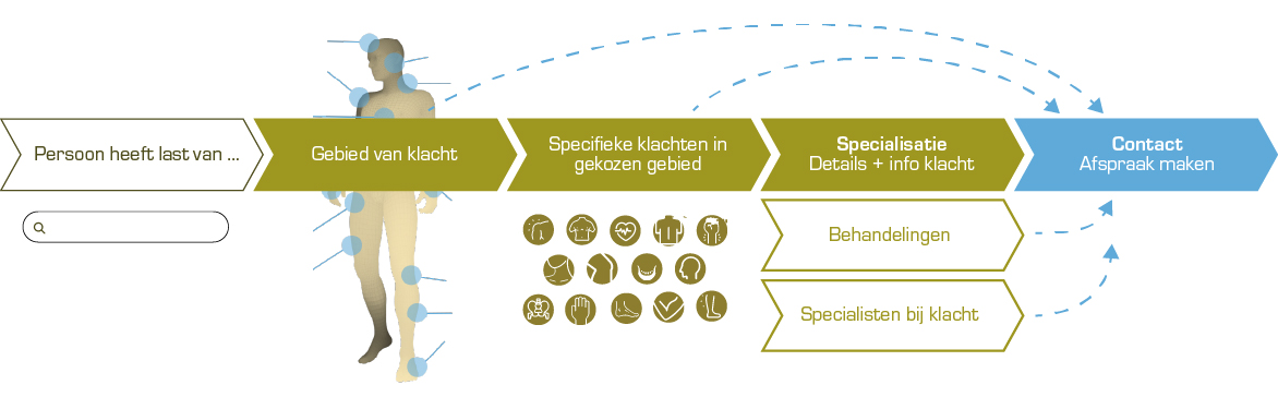 We bedachten eenvoudige klachtenkeuzehulp. We maakten een structuur waarin de klachten samenhangen hebben met behandelingen én met behandelaars. Vanuit deze benadering van informatie is de bezoeker-met-klacht centraal gesteld.