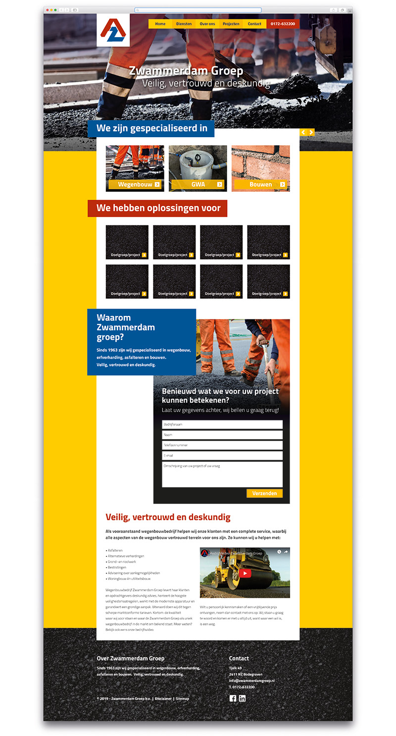 Als platform is gekozen voor WordPress, met het thema ‘Frost’. De eerdere website (die wij ook maakte) was verouderd in gebruik en design. In het re-design komen wel de huisstijl kleuren terug, maar op een manier die beter aansluit bij de Zwammerdam Groep. Dit geeft het gevoel van competentie, rust en zelfverzekerdheid. In het logo is alleen rood, wit en blauw vertegenwoordigd. Door de steunkleur geel slim te gebruiken oogt het geheel minder ‘bont’, is er meer visuele rust en wordt het oog geleid naar daar waar we dat willen.